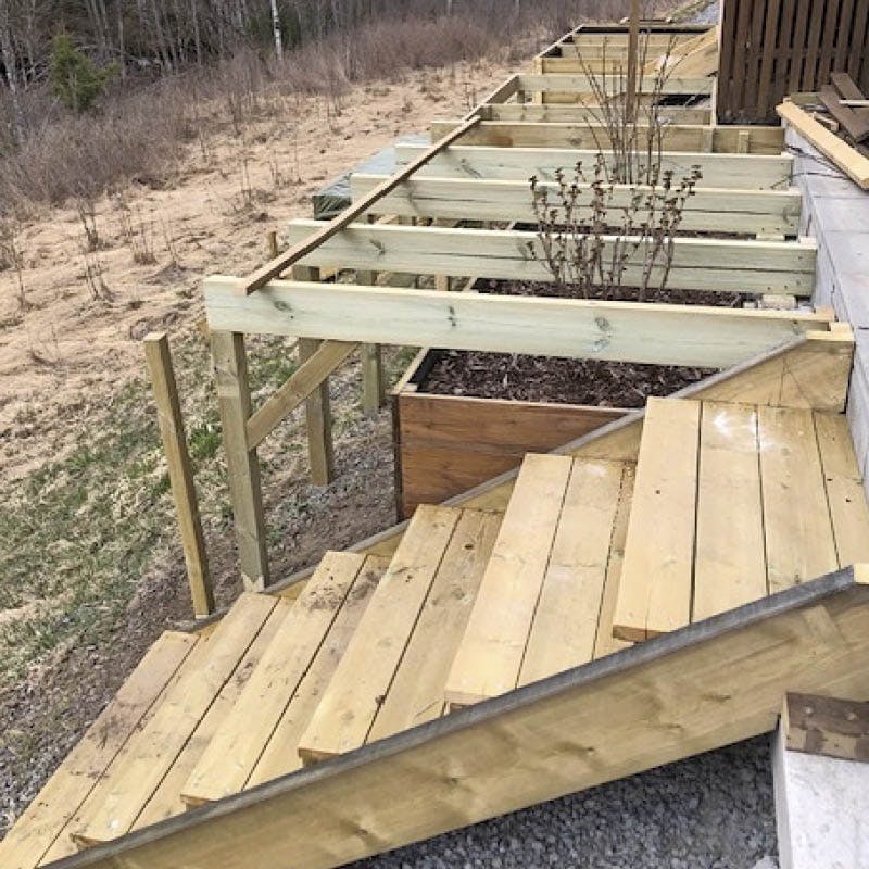 - Bygg eventuelt rekkverk: Hvis du har planlagt rekkverk, er det lurt å montere stolpene før du fester selve rekkverket. Sørg for solid forankring.