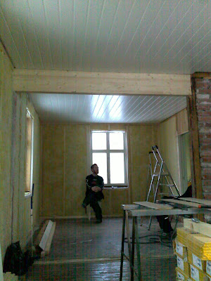 Legge nytt tak i stua ( takplater ). Stuen og liten gang har en ferdig malt « undertak» som er relativt rett.