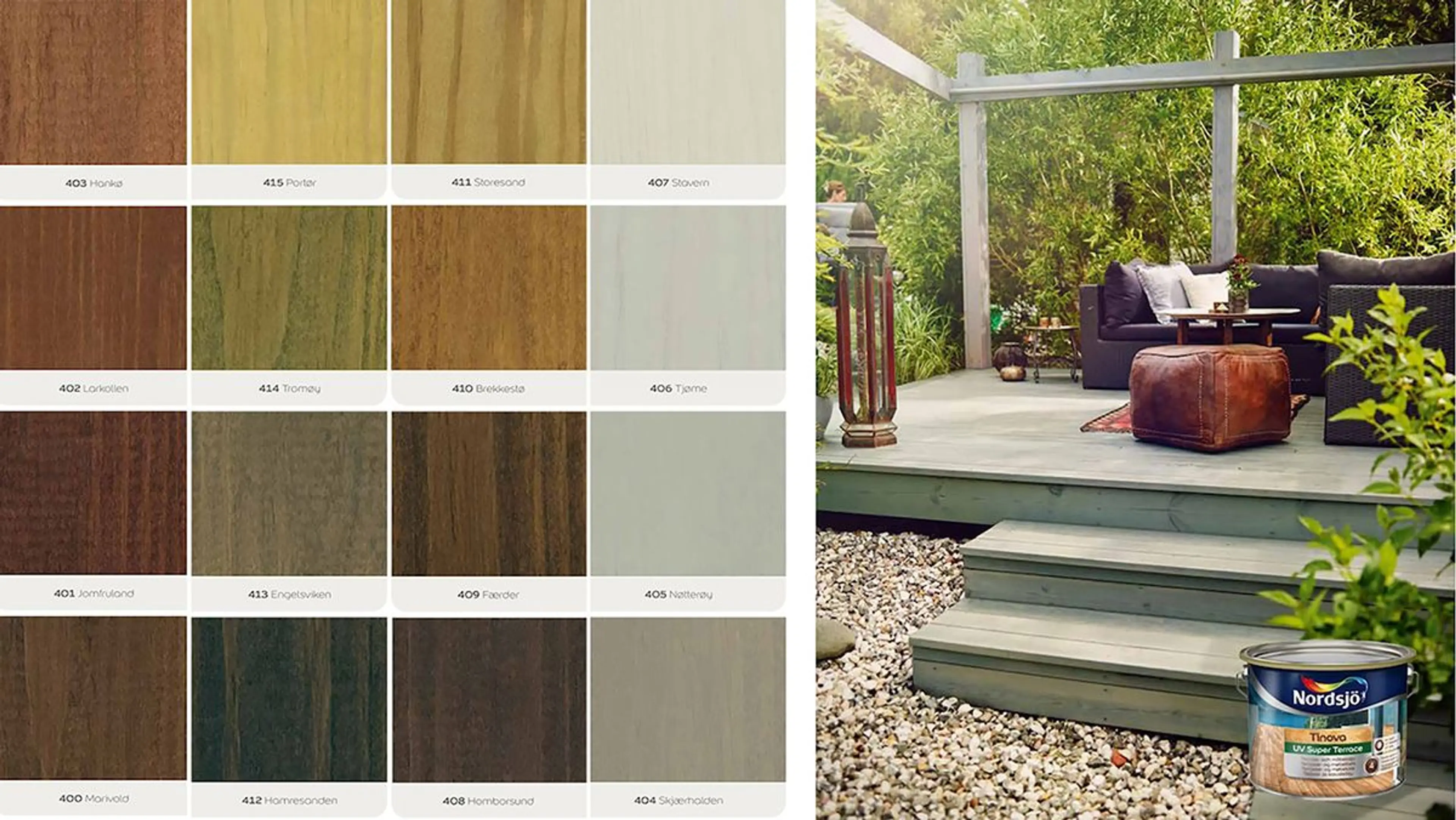 - Teak: En varm brunfarge som etterligner naturlig teaktre, perfekt for å gi terrassen en klassisk og elegant utseende.